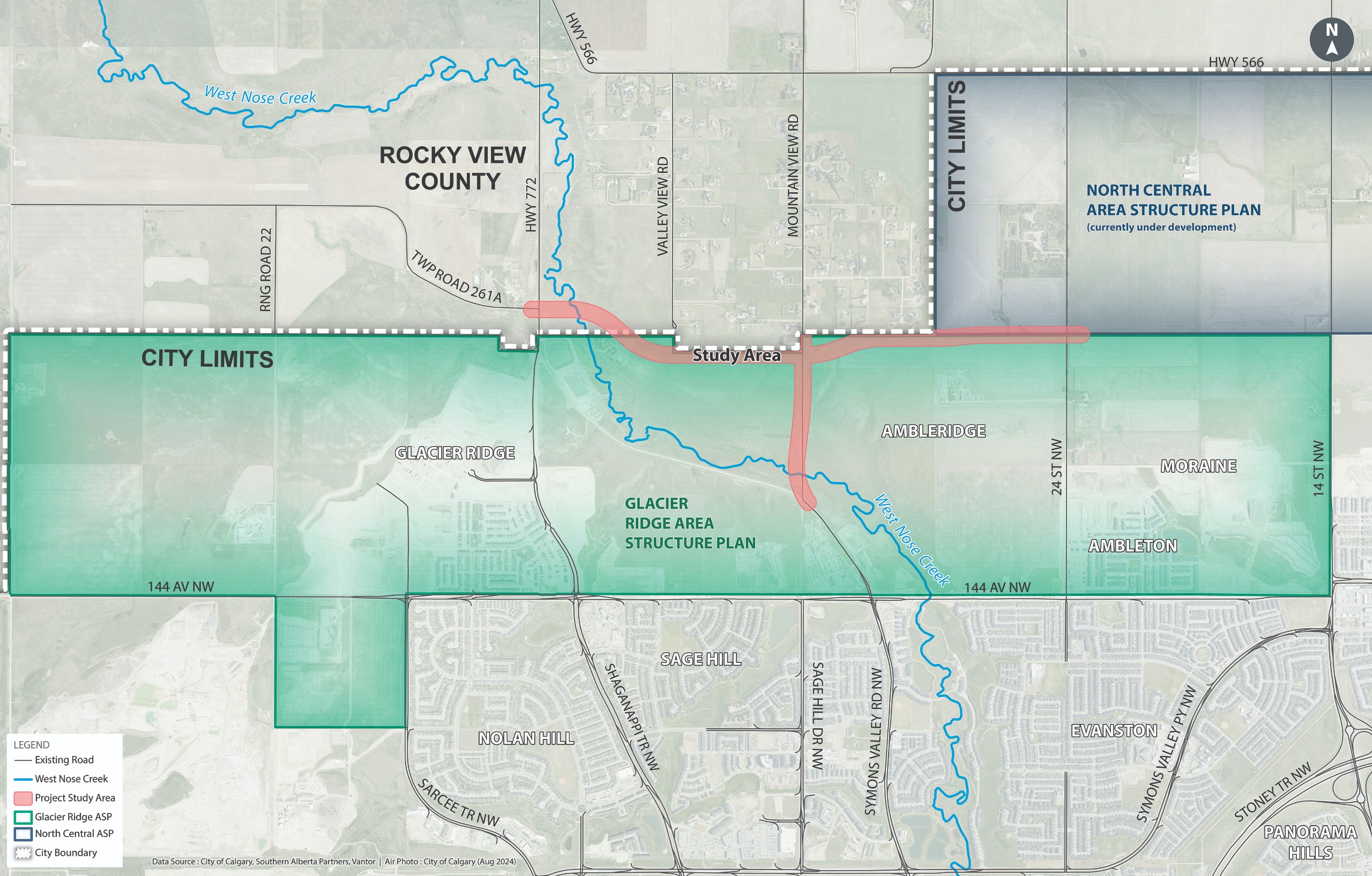 The study area includes a new roadway planned for 160 Avenue N.W. that will connect to Highway 772 / Shaganappi Trial N.W., Mountain View Road N.W., and 24 Street N.W. / Panorama Road N.W.