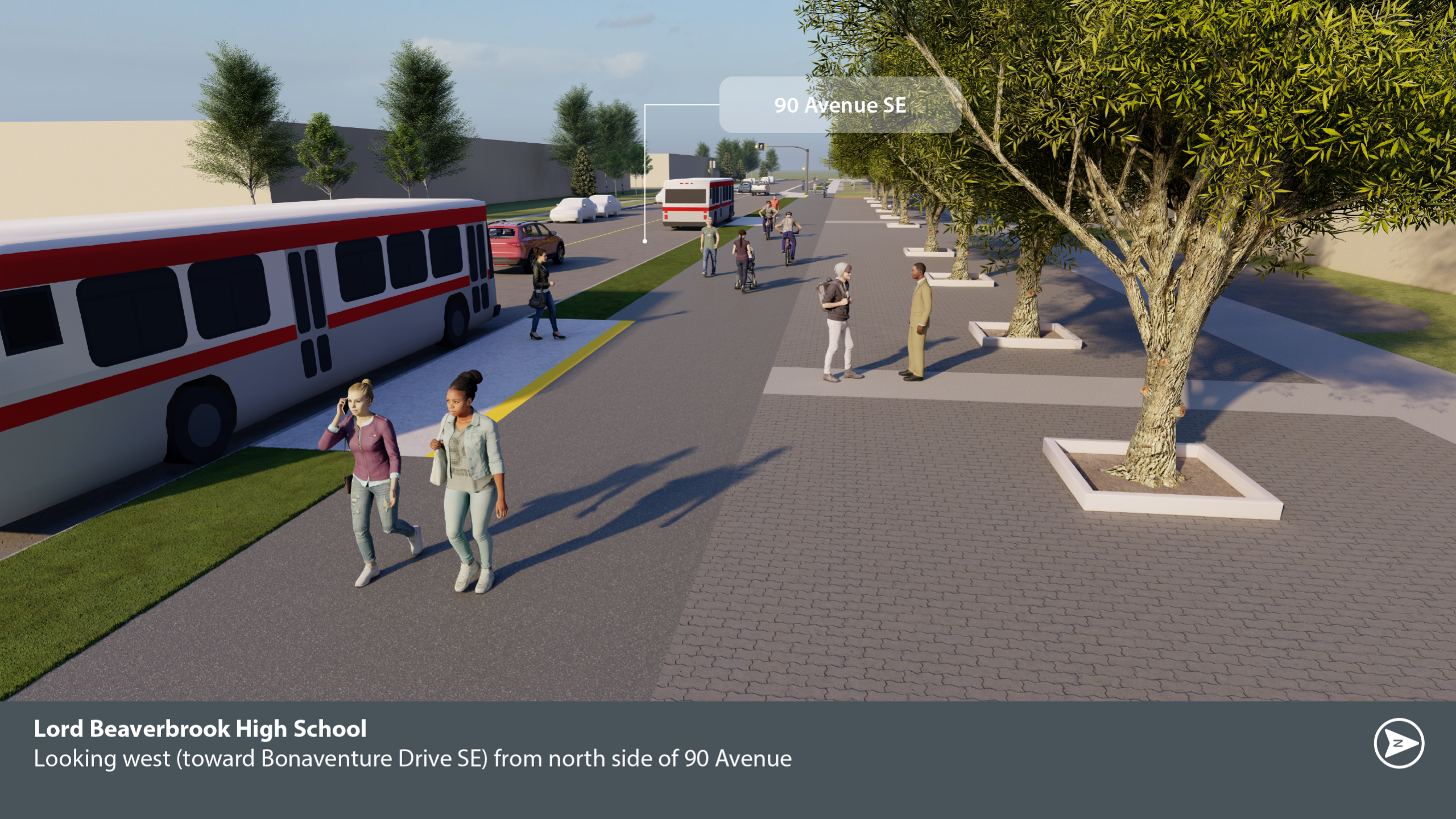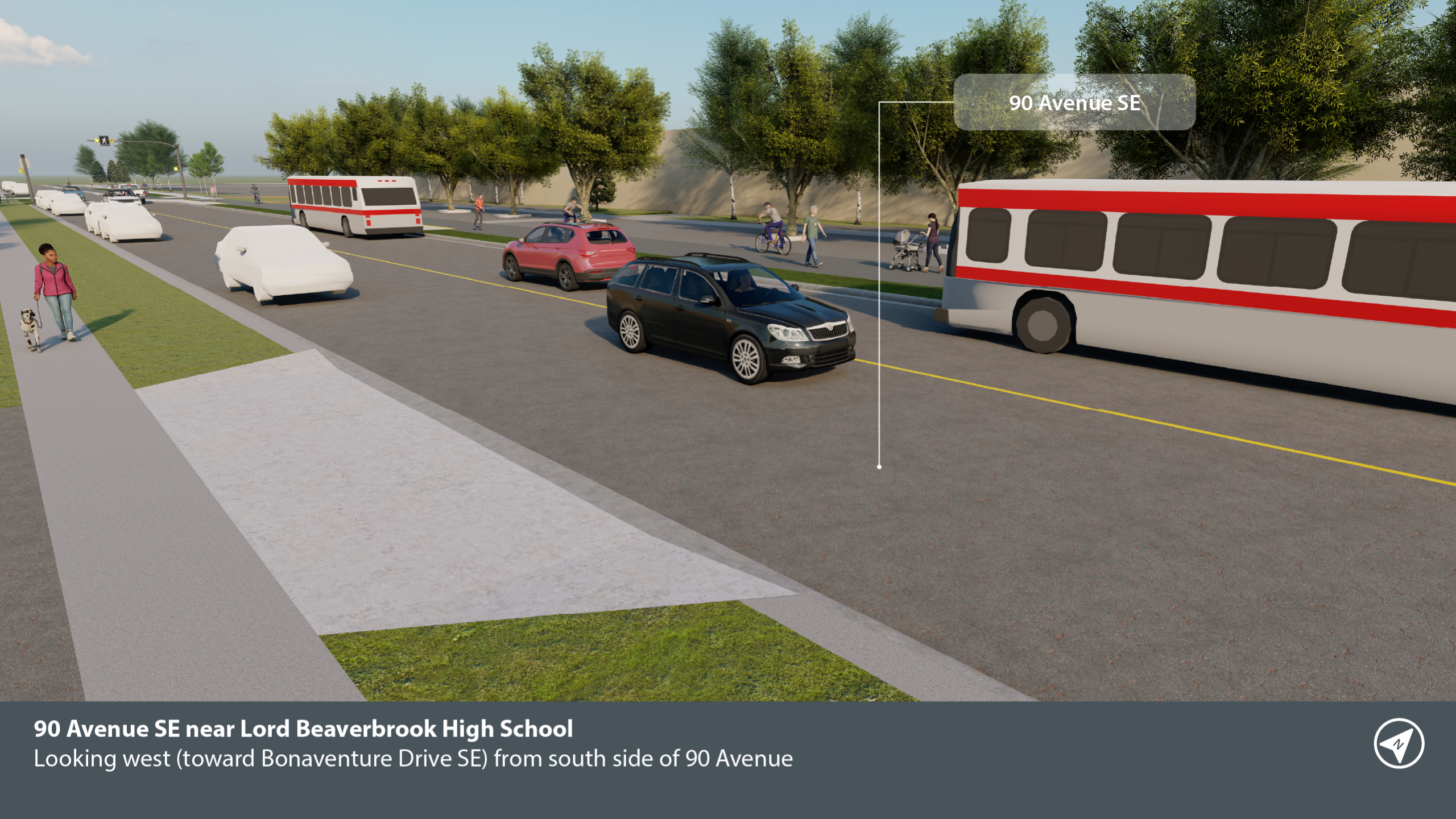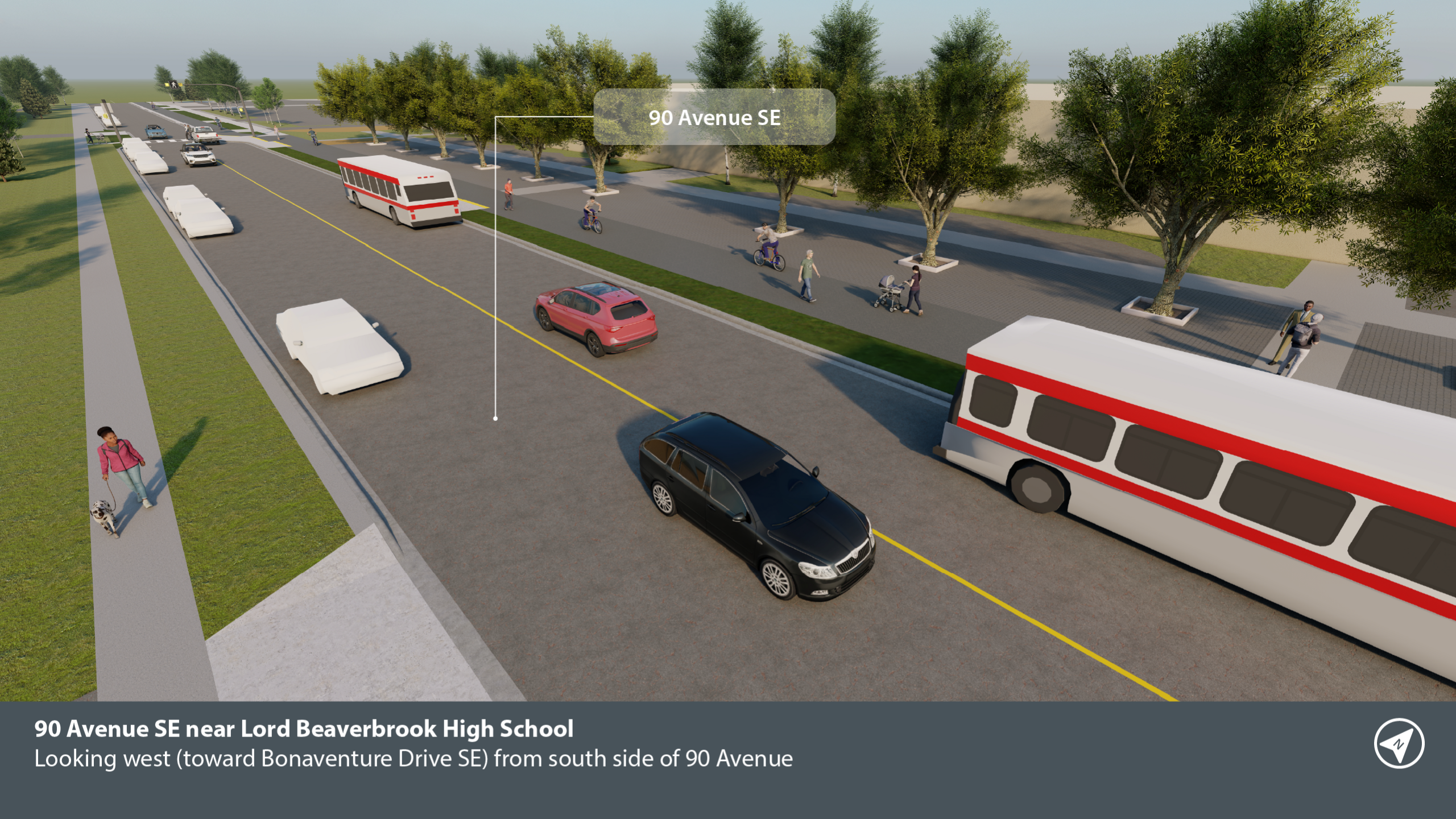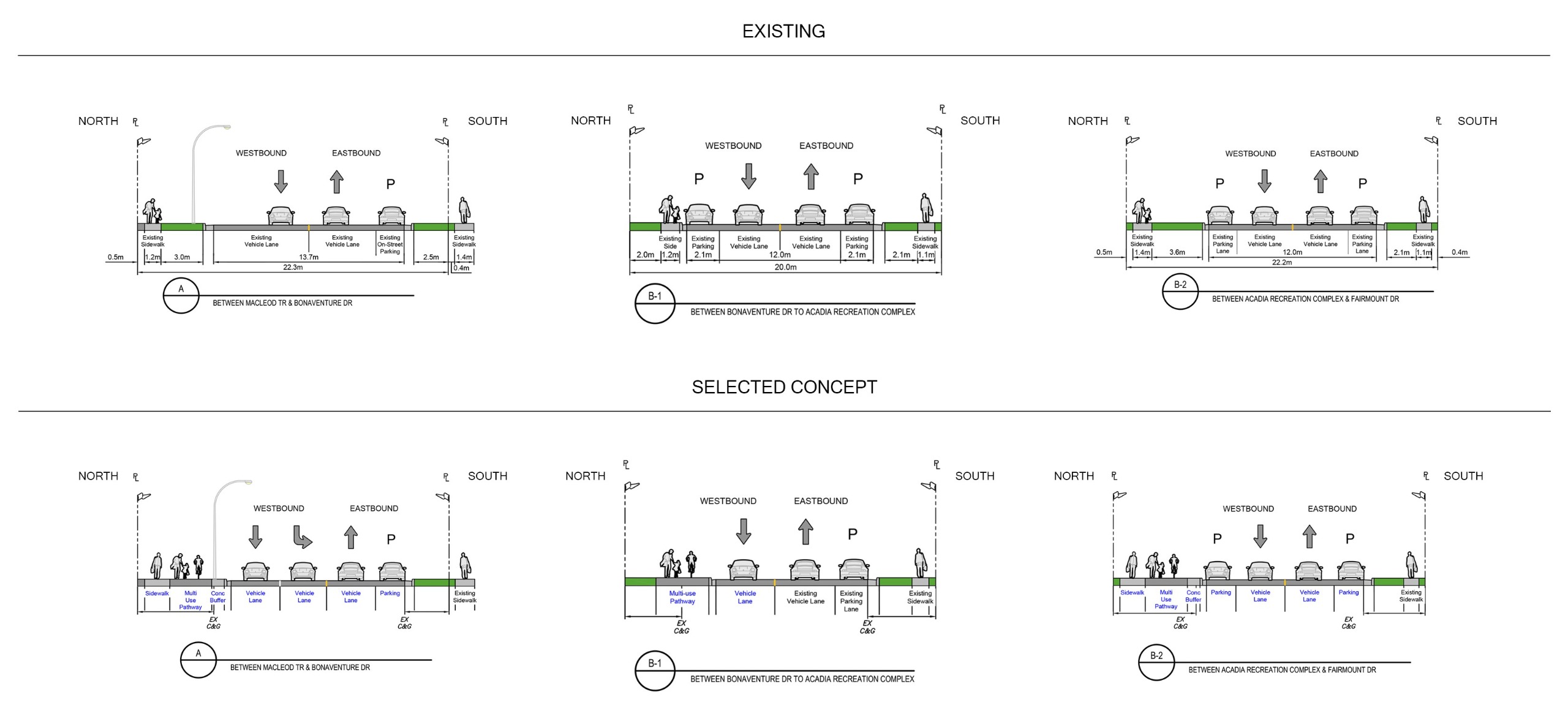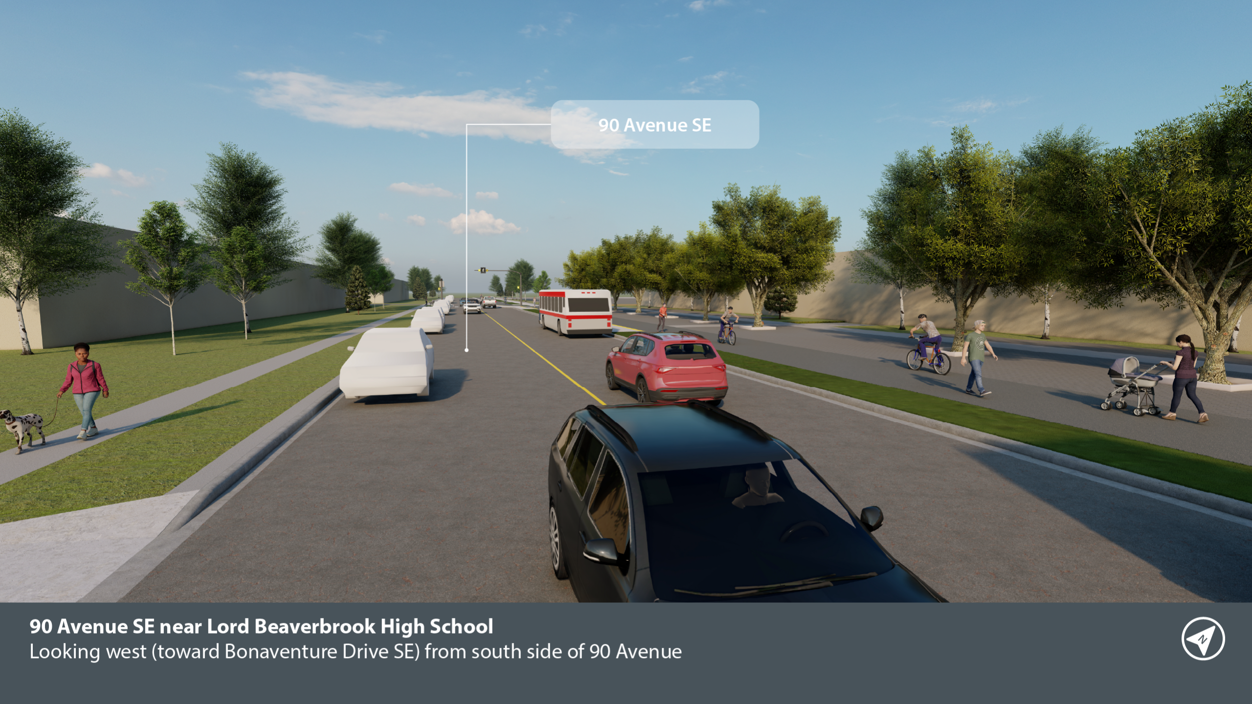 Segment 1 is approximately 860m and stretches from Macleod Trail S to Fairmount Drive S.E. A multi-use path has been added on the north side of the road in the boulevard space with some parking removed and the road narrowed slightly to reduce vehicle speeds to make room for the multi-use path. In some sections, the sidewalk is removed to provide enough space for the multi-use path.