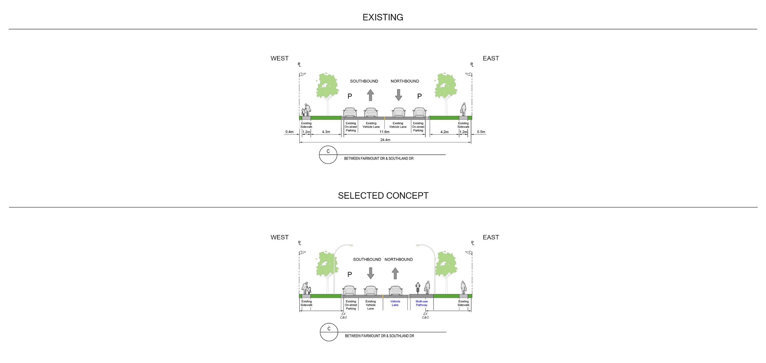 Segment 2 is approximately 1.5km and stretches from Fairmount Drive S.E. to Southland Drive S.E. The roadway was narrowed to reduce vehicle speeds. To achieve this, most parking will be removed on the north/east side of the road, while all parking is kept on the south/west side of the road. Some trees may be removed where space is limited. A multi-use pathway has been added on the north/east side of the road in the boulevard space to provide continuous connection between Segment 1 and 3.