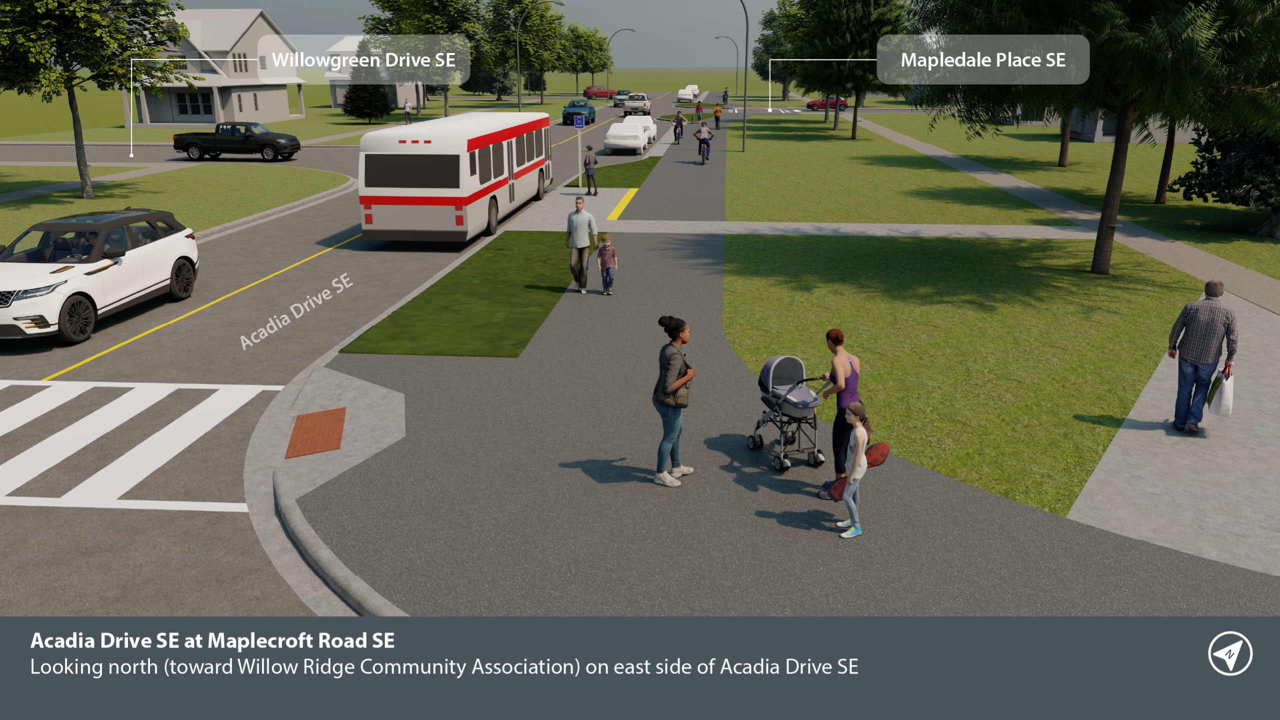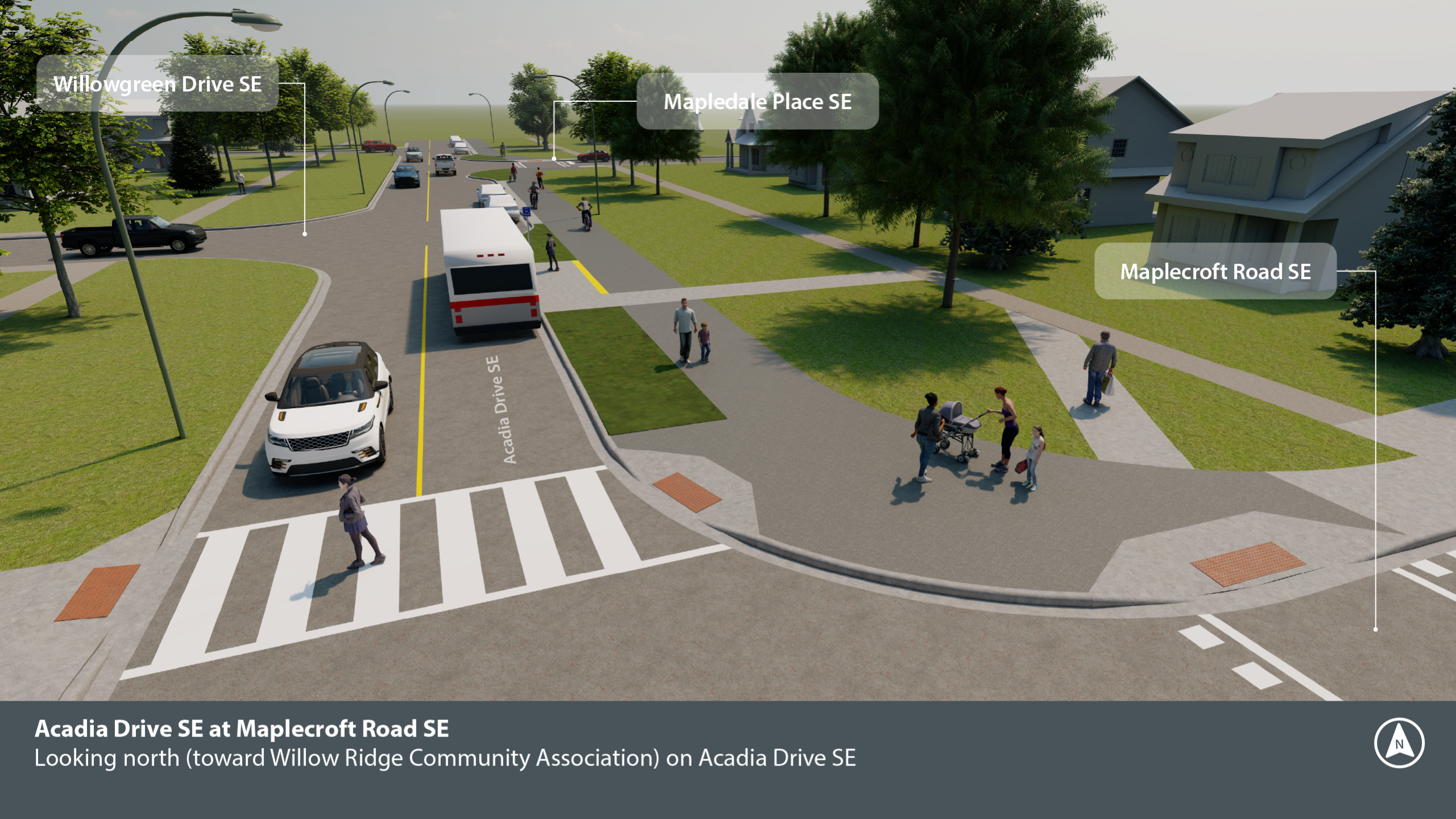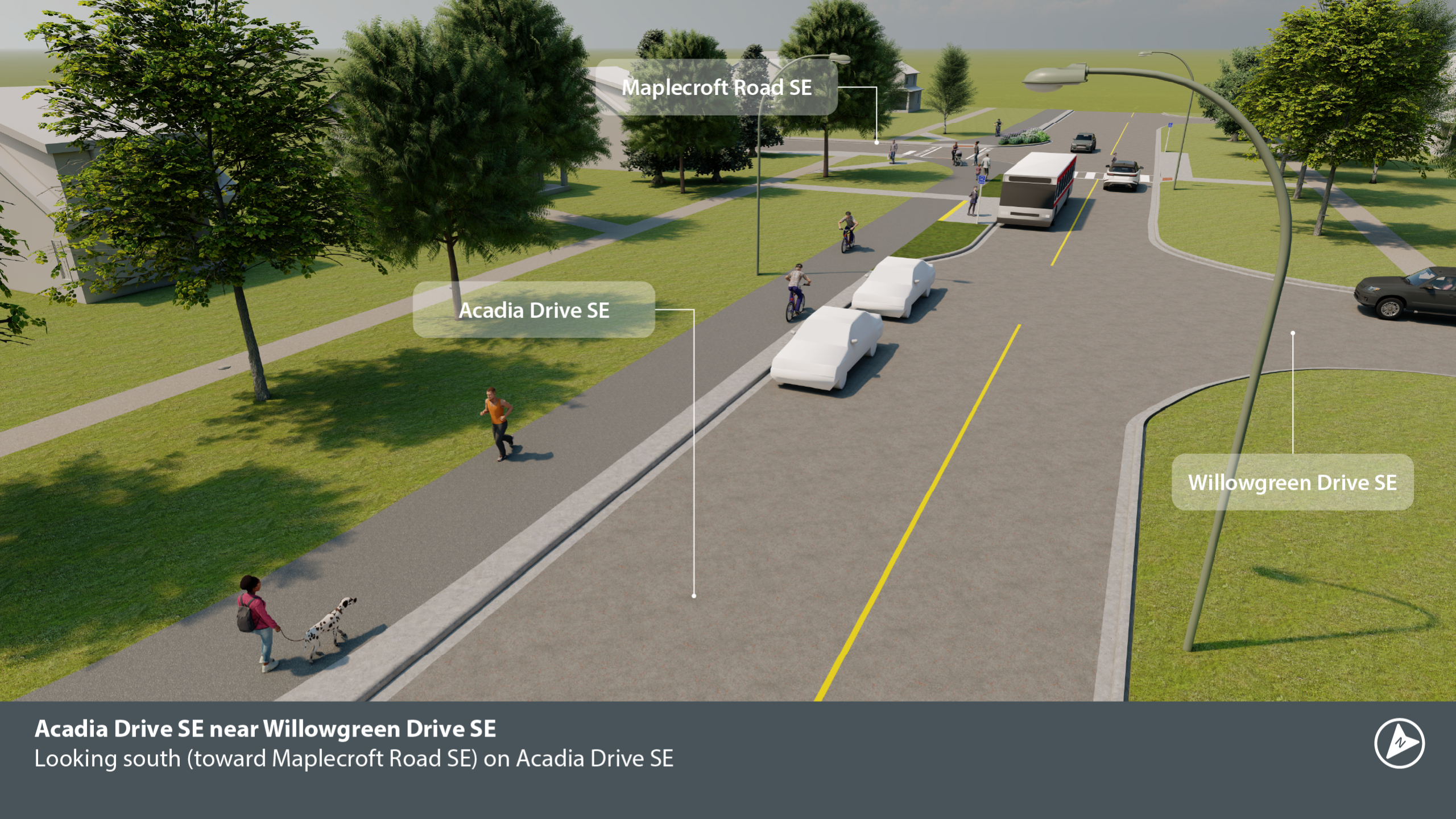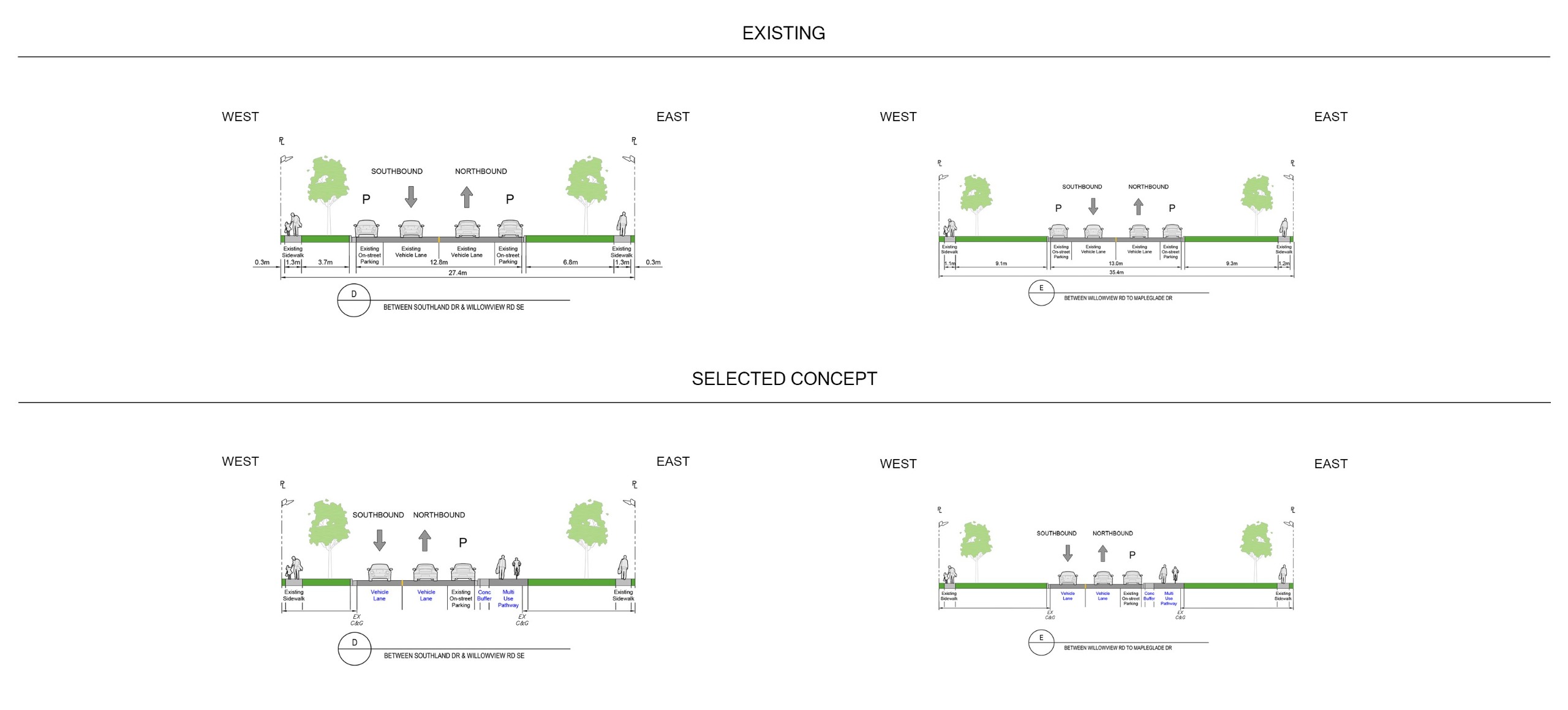 Segment 3 is approximately 2km and stretches from Southland Drive S.E. to Anderson Road S.E. The roadway was narrowed to reduce vehicle speeds. To achieve this, some parking will be removed. Parking is maintained on one side of the road for most of the segment but alternates sides. A multi-use pathway has been added on the east side of the road in the boulevard space, and there are no anticipated impacts to existing trees.