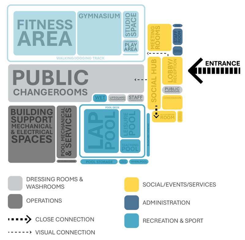 The location, building size, and core features, such as pools, fitness areas, gyms, multipurpose rooms, and turf fields, are already set based on approved master plans, technical requirements and funding commitments.