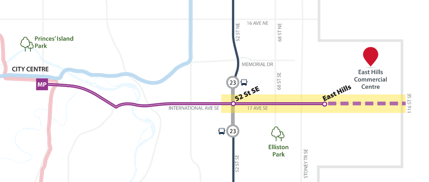 The MAX Purple East Extension BRT study focuses on extending the existing MAX Purple transitway along 17 Avenue east of 54 Street. S.E. to 116 Street S.E., enhancing transit connectivity between downtown and Inglewood to International Avenue.