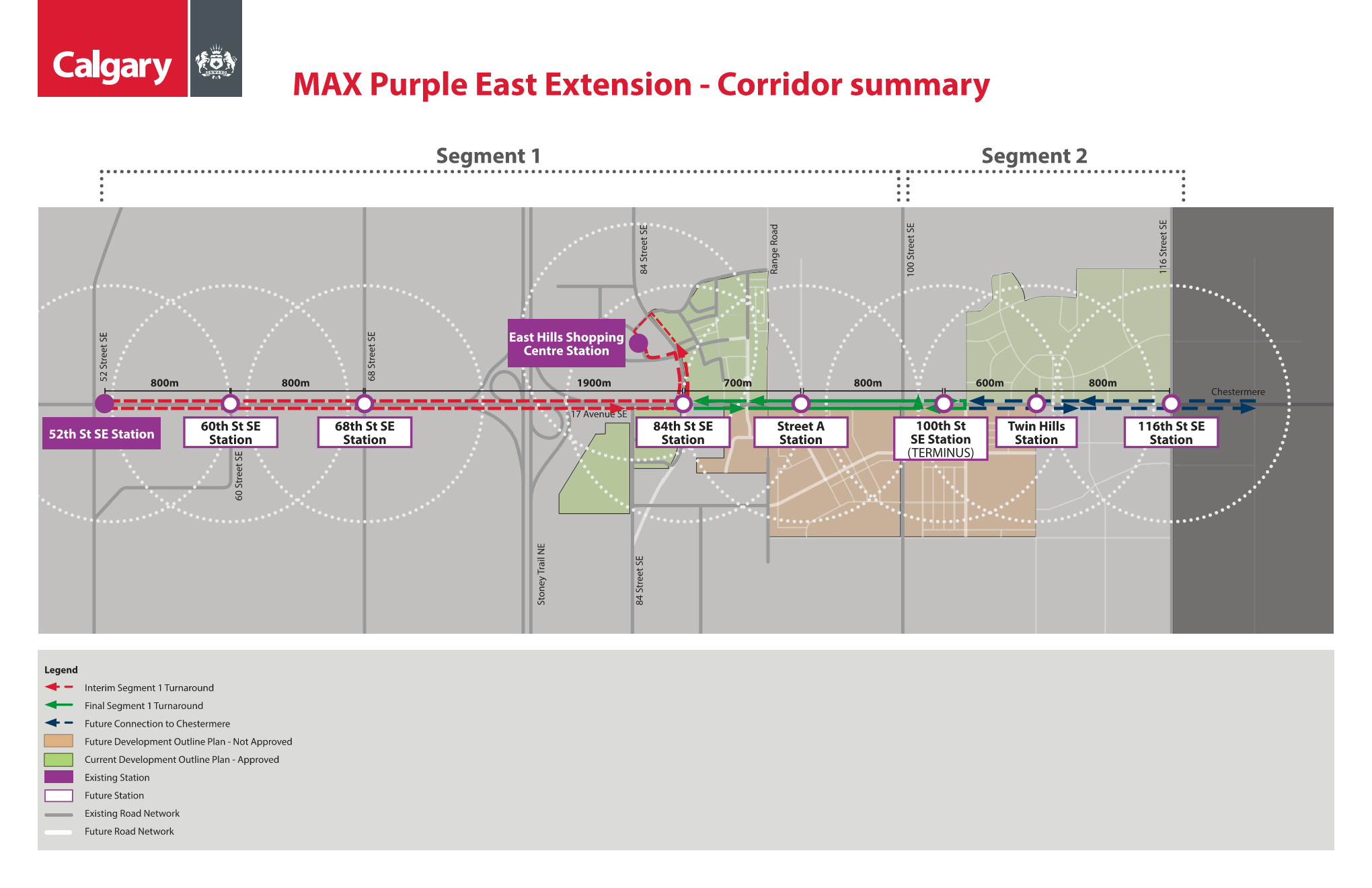 - The design elements for the Max Purple Extension are developed for articulated buses, assuring the ability for Calgary Transit to respond effectively to the service demand along the corridor. Ultimate servicing will be determined by Calgary Transit.