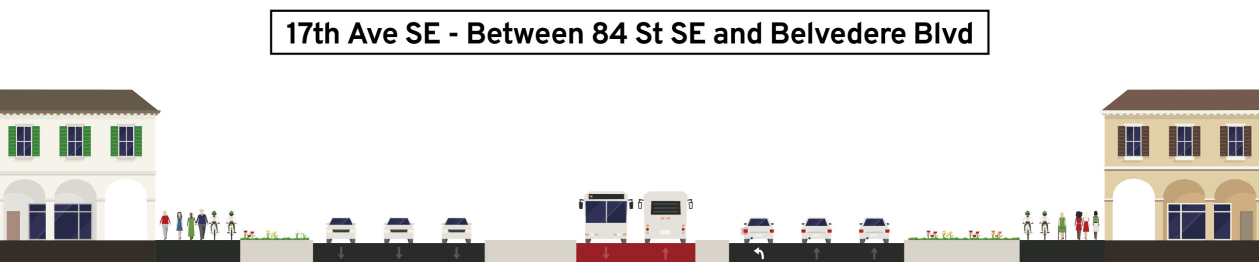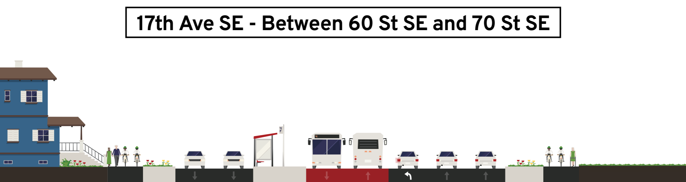 These sections of 17 Ave. S.E. between 60th Street and 70th Street, and 84 Street and Belvedere Boulevard, will consist of MAX Purple bus lanes, roadways and walking and wheeling connections.