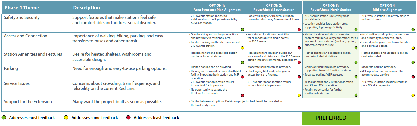 The preferred option (Option 3) was chosen because it provides the best balance of benefits for the community and future transit users. It will deliver high-quality transit service with well-designed station facilities, including a park and ride and bus terminal. The dedicated LRT corridor reduces future risks and helps the system run more efficiently, while also minimizing noise and visual impacts for nearby residents. This option supports safe and accessible walking, wheeling, and transit connections, aligns with feedback received during Phase 1 engagement, and offers similar construction, operating, and maintenance costs compared to the other options.