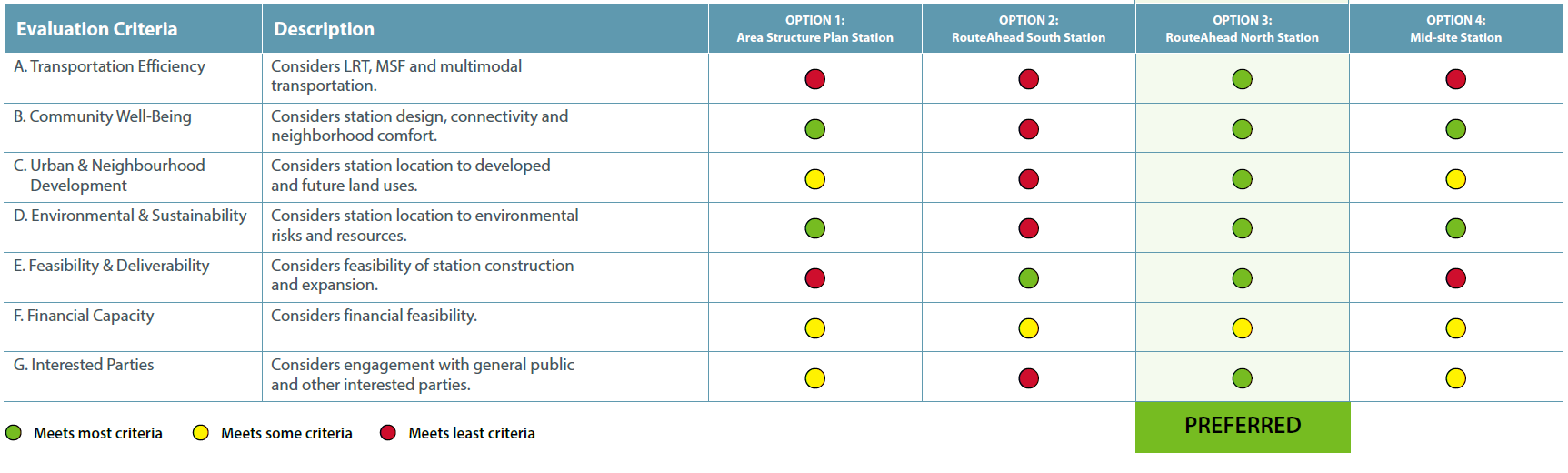 The table below shows how each option performed against these criteria using a green (meets most criteria), yellow (meets some criteria), and red (meets least criteria) rating system.