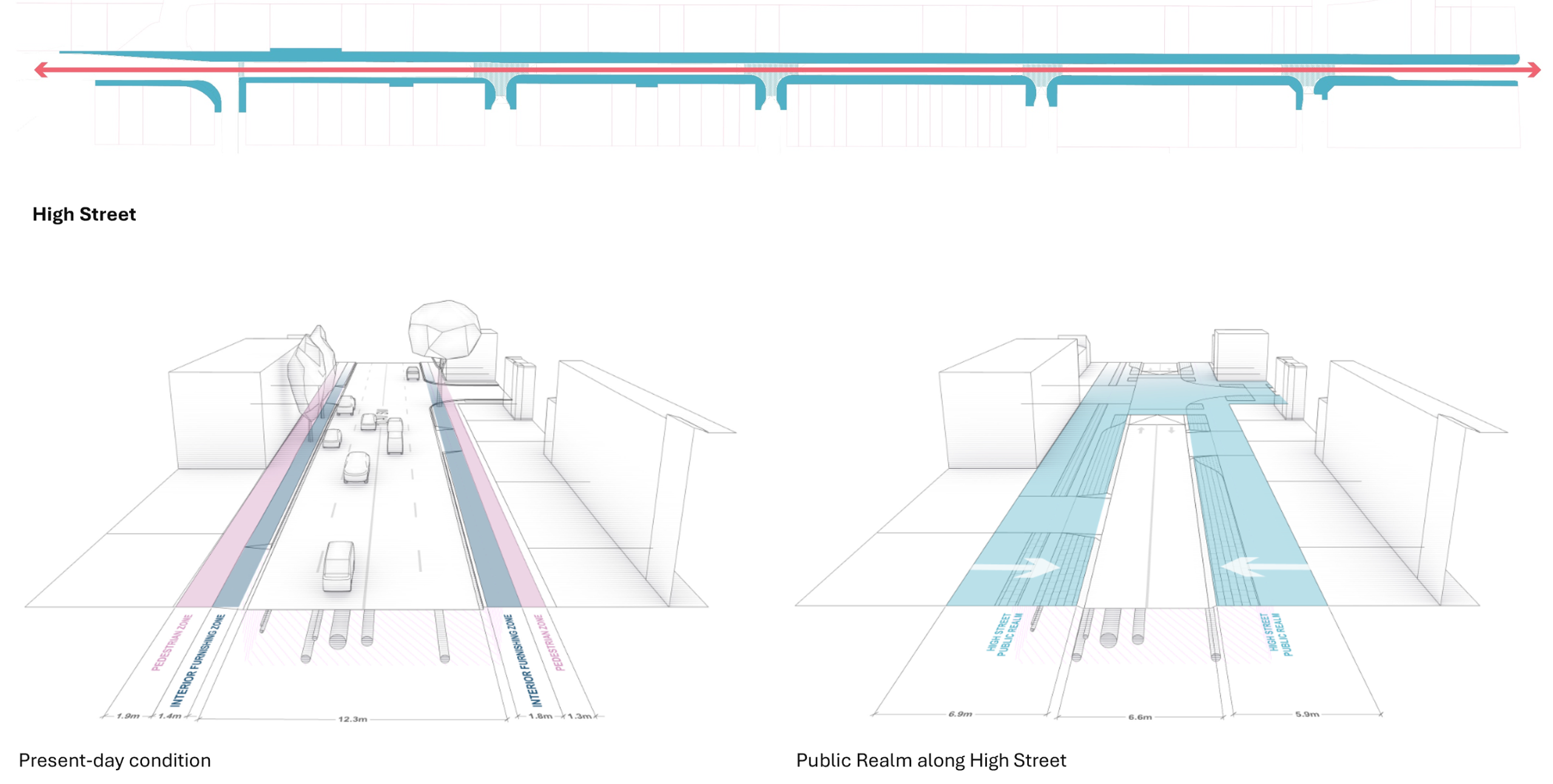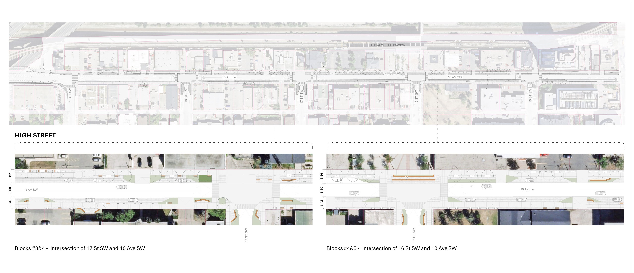 High Street reimagines 10 Avenue SW as a safe, accessible, and community-oriented corridor, maintaining a continuous roadway alignment for intuitive navigation and equitable treatment of both sides of the street. Raised intersections introduce a rhythmic flow, calming traffic and signaling arrival at key blocks while creating opportunities for gathering and activation. This future-focused design preserves existing parking, supports adaptable enhancements, and fosters a welcoming public realm that evolves with community needs, ensuring all users feel included and connected.