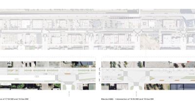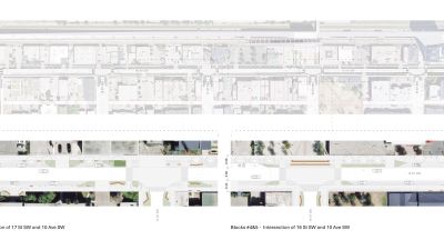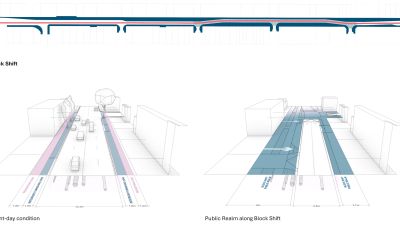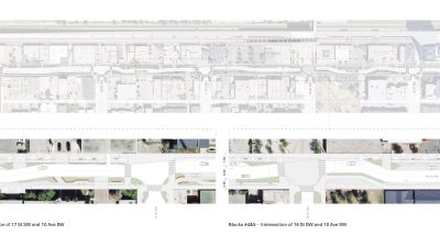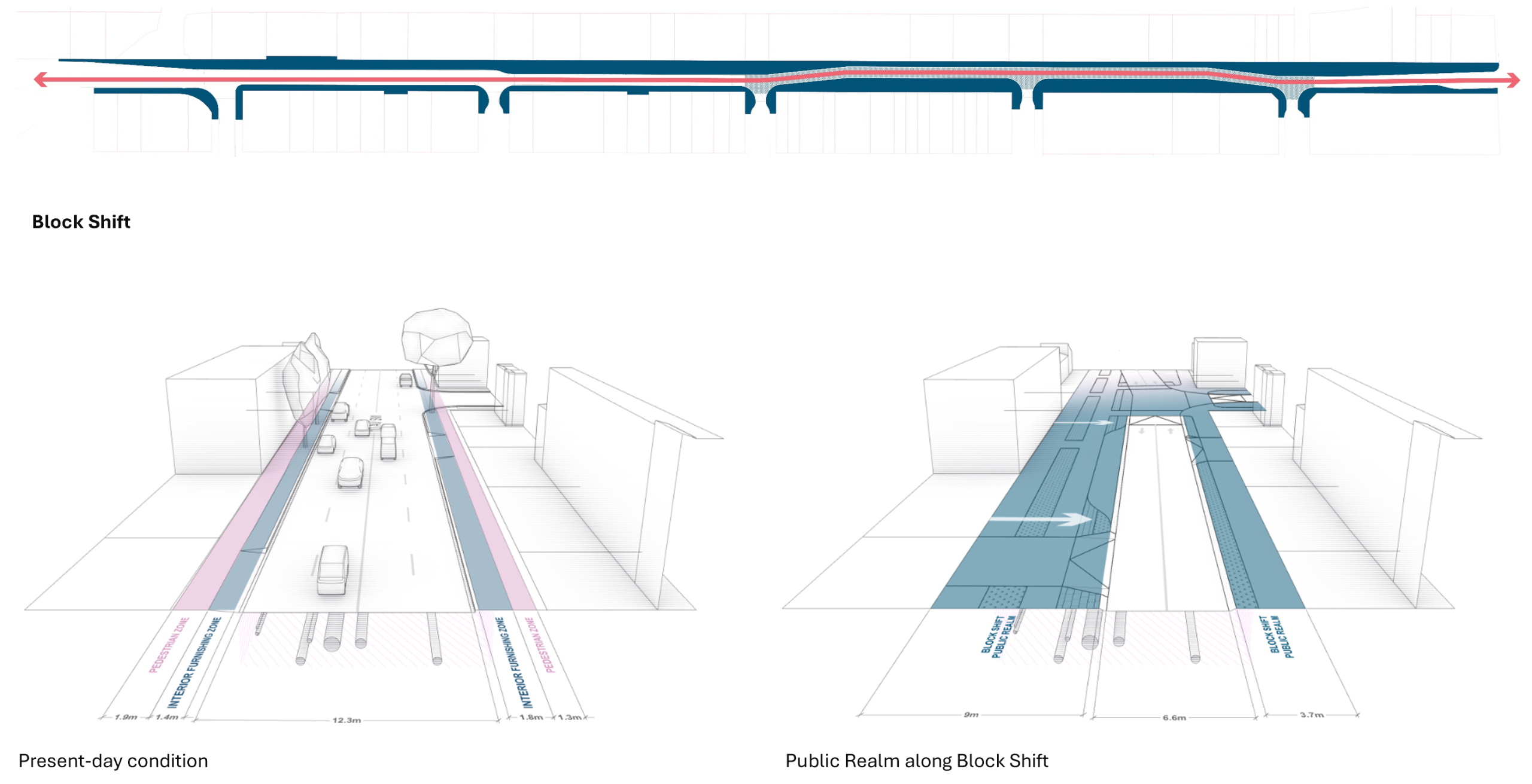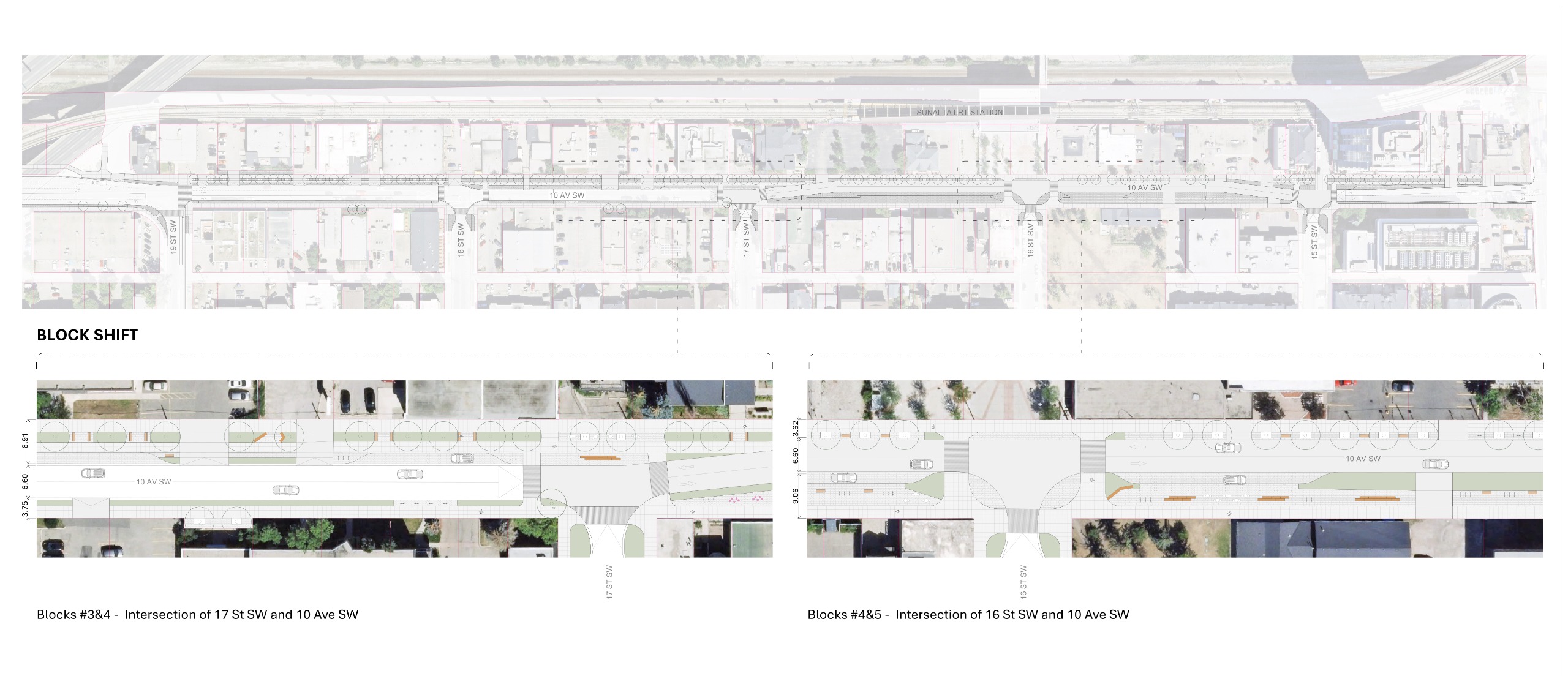 Block Shift reimagines 10 Avenue SW as a vibrant pedestrian-focused corridor, with select blocks strategically shifted south to create wider, sunlit sidewalks on the north side of the street. These expanded zones offer space for social activity, enhanced vegetation, and diverse public realm configurations. A raised intersection adjacent to the LRT plaza and Community Hub introduces a festival zone, forming a continuous, programmable surface for year-round activation. This thoughtful design improves pedestrian flow, encourages community gathering, and reinforces the street’s role as a central place for connection and creativity.