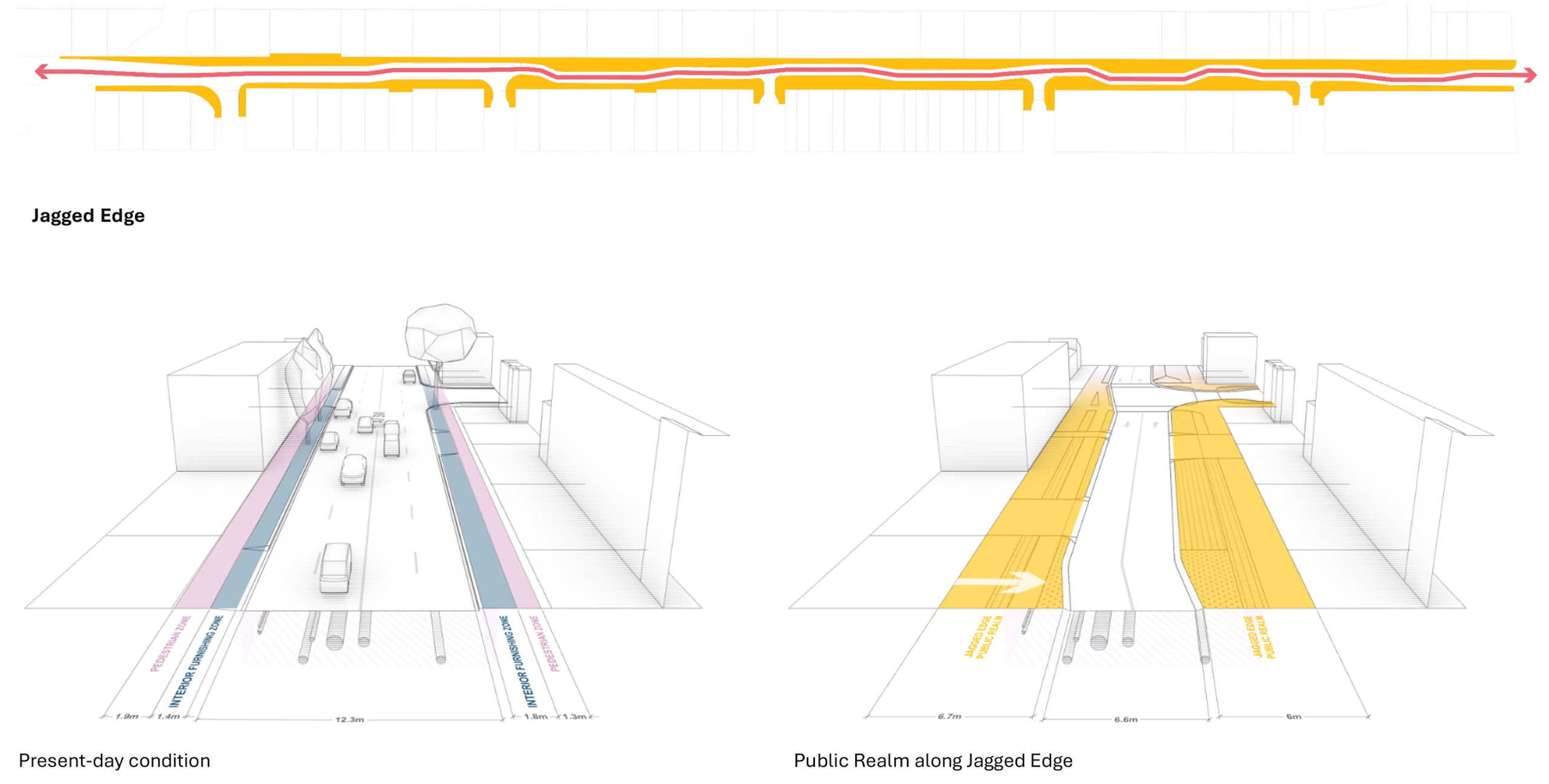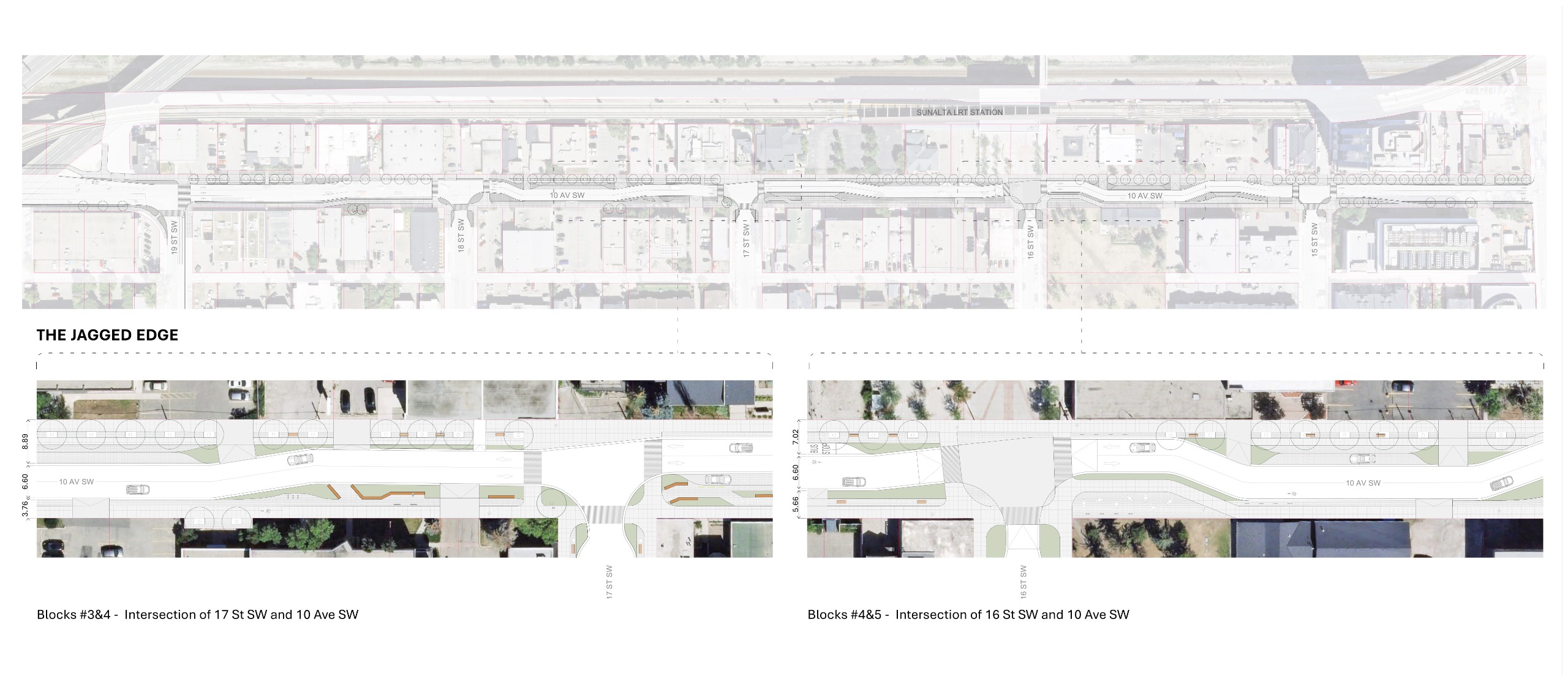 Jagged Edge invites people into a streetscape designed for discovery, where fluid sidewalk widths and asymmetrical roadway alignment create space for lingering, interaction, and creativity. Along 10 Avenue SW, the concept fosters spontaneous encounters and celebrates Sunalta’s vibrant identity, shaping a public realm that feels welcoming, engaging, and deeply rooted in community.