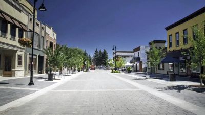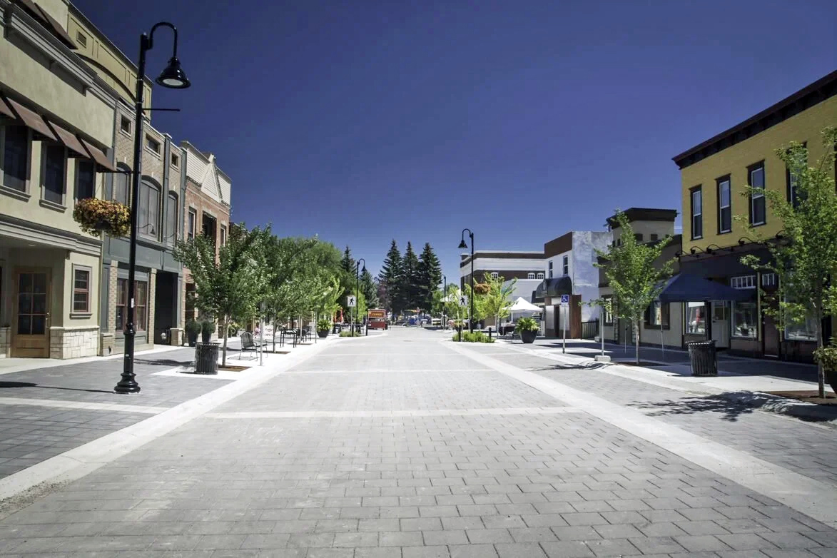 Widened street line with trees and grass and flowers. Market style fronts for businesses.