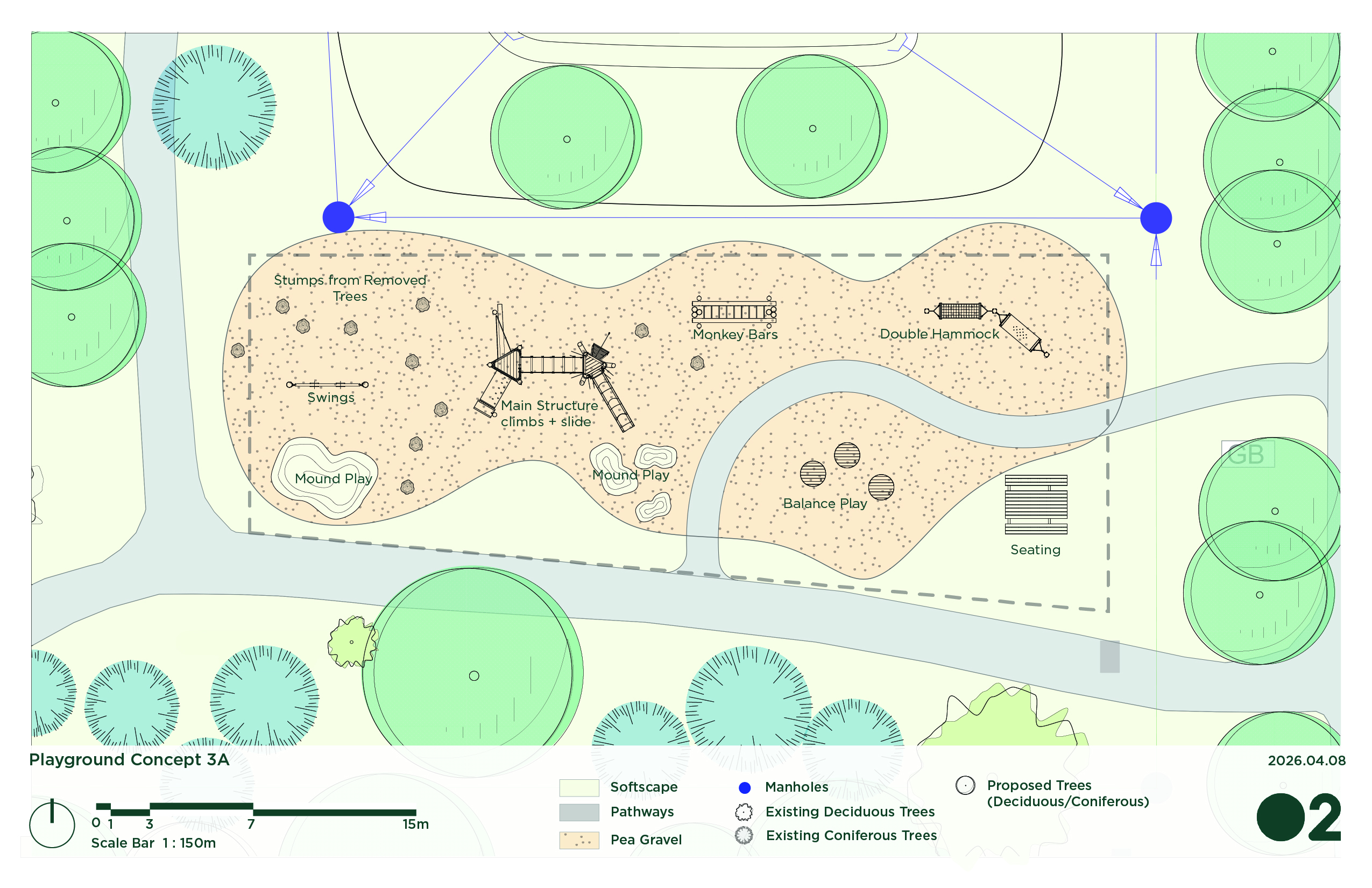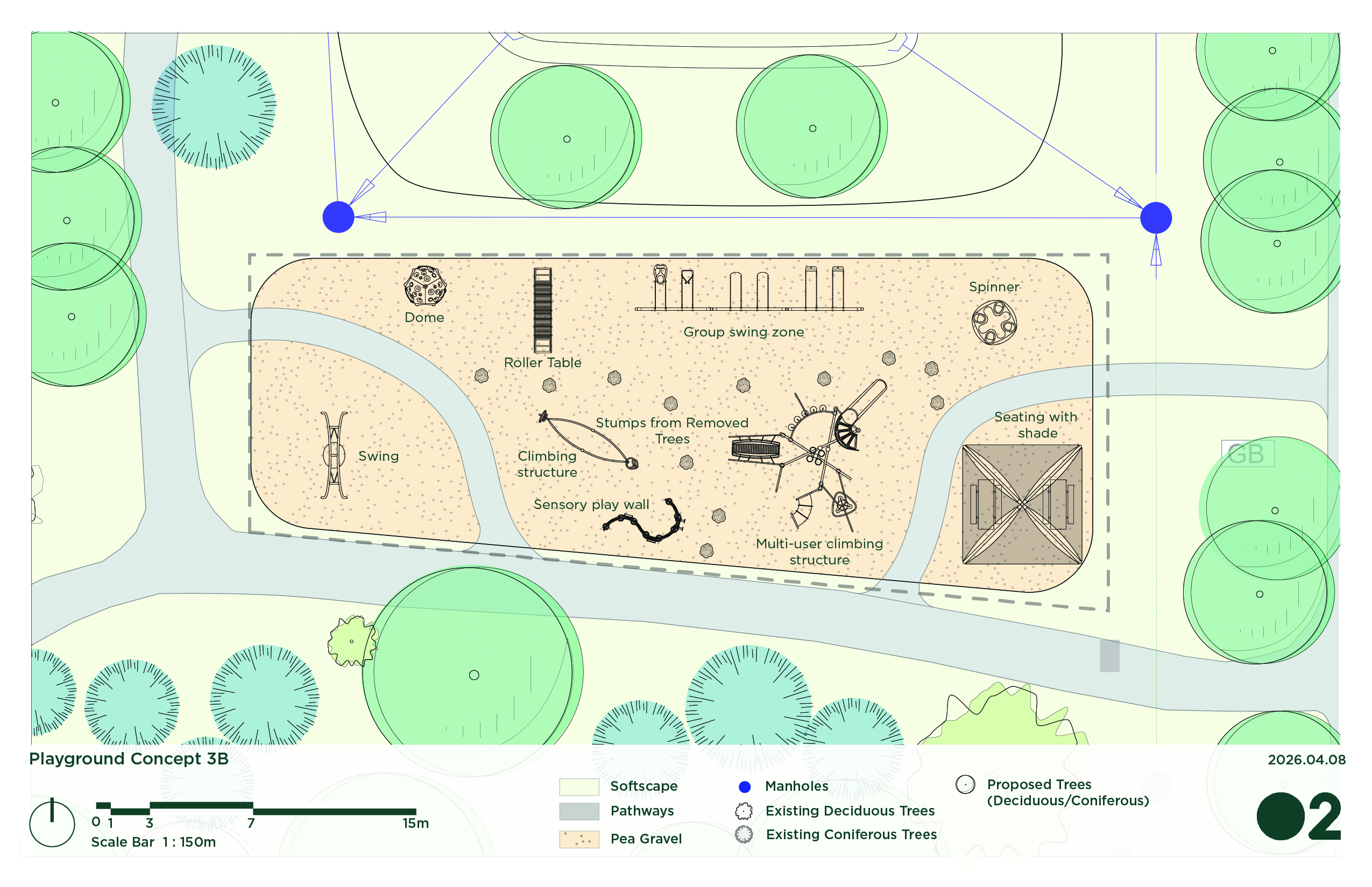The image below shows the overall park redesign which balances community use with site constraints such as flooding, utilities, and existing trees. A flexible central lawn functions as stormwater management during peak events and open green space when dry, with retained pathways, key tree preservation, a relocated accessible playground, and inclusive spaces for all ages.