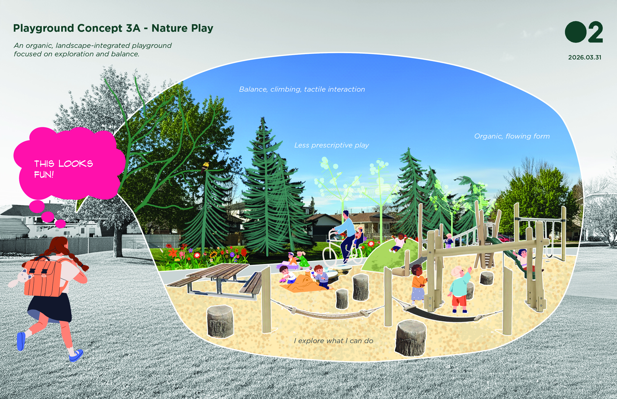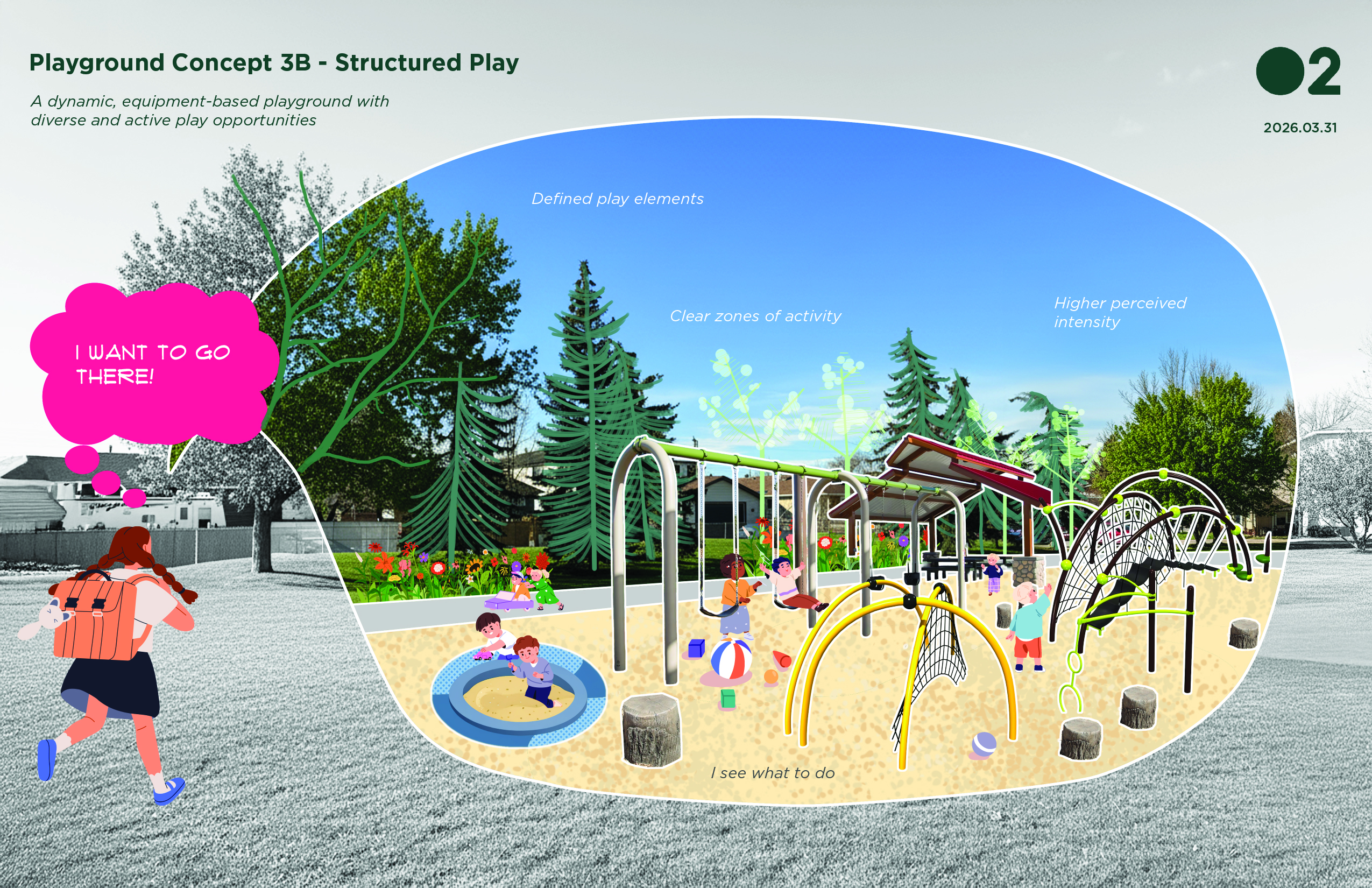 A part of this project involves relocating the existing playground to a slightly different location, as noted in concept re-design layout, on site to accommodate the dry pond. This presents an opportunity to improve the playground with new equipment. You can view the concept images of the potential designs below.