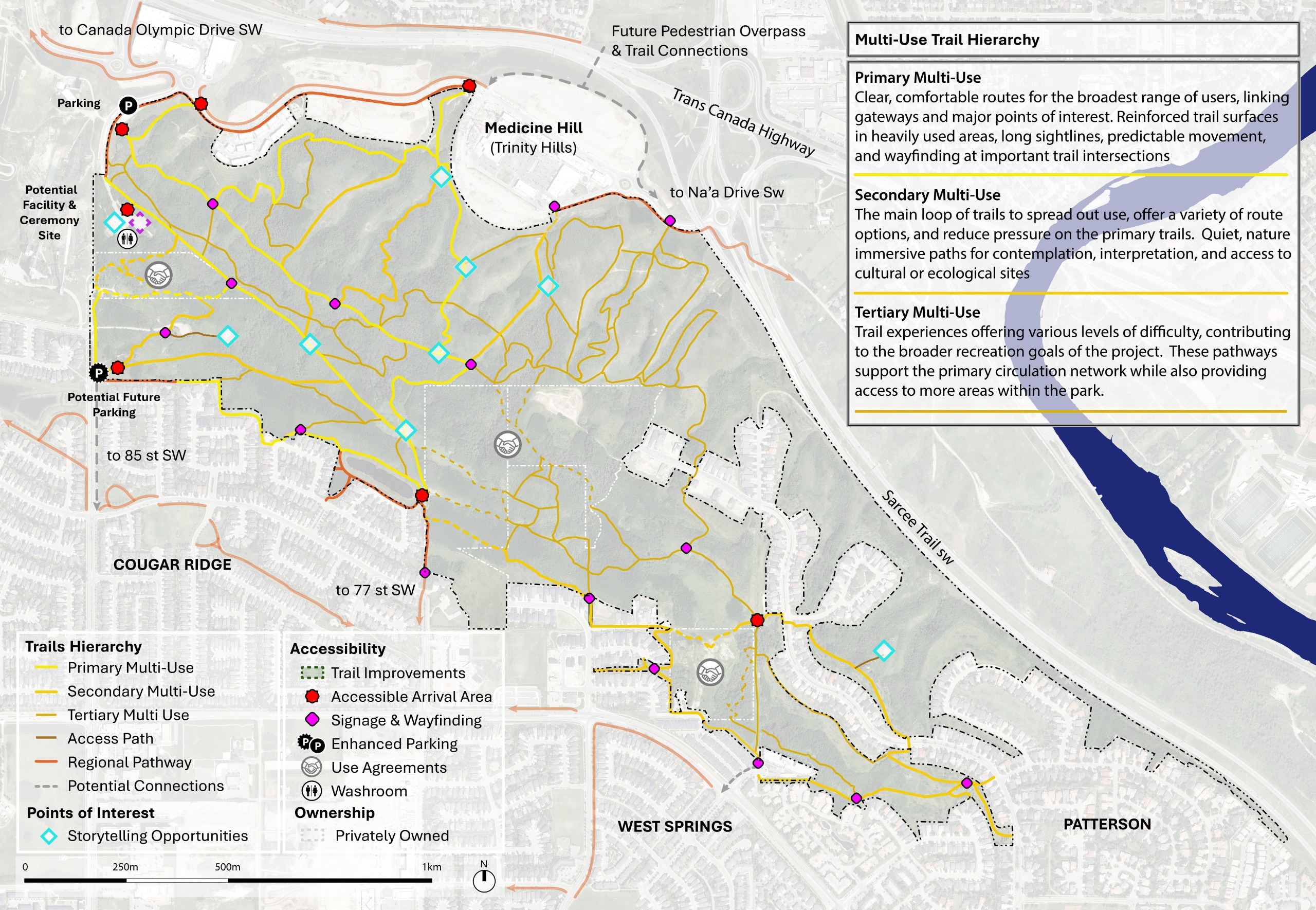 - All trails remain multi‑use, including walking, running, biking, and winter use