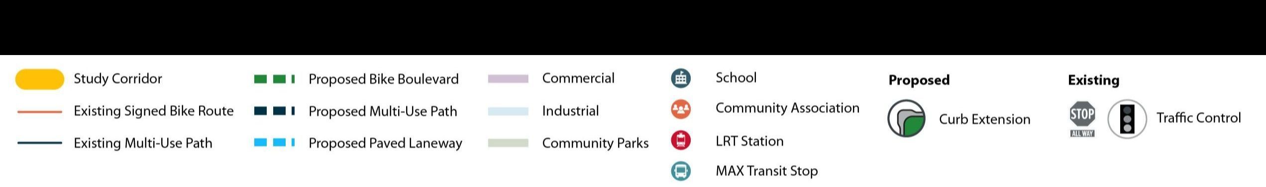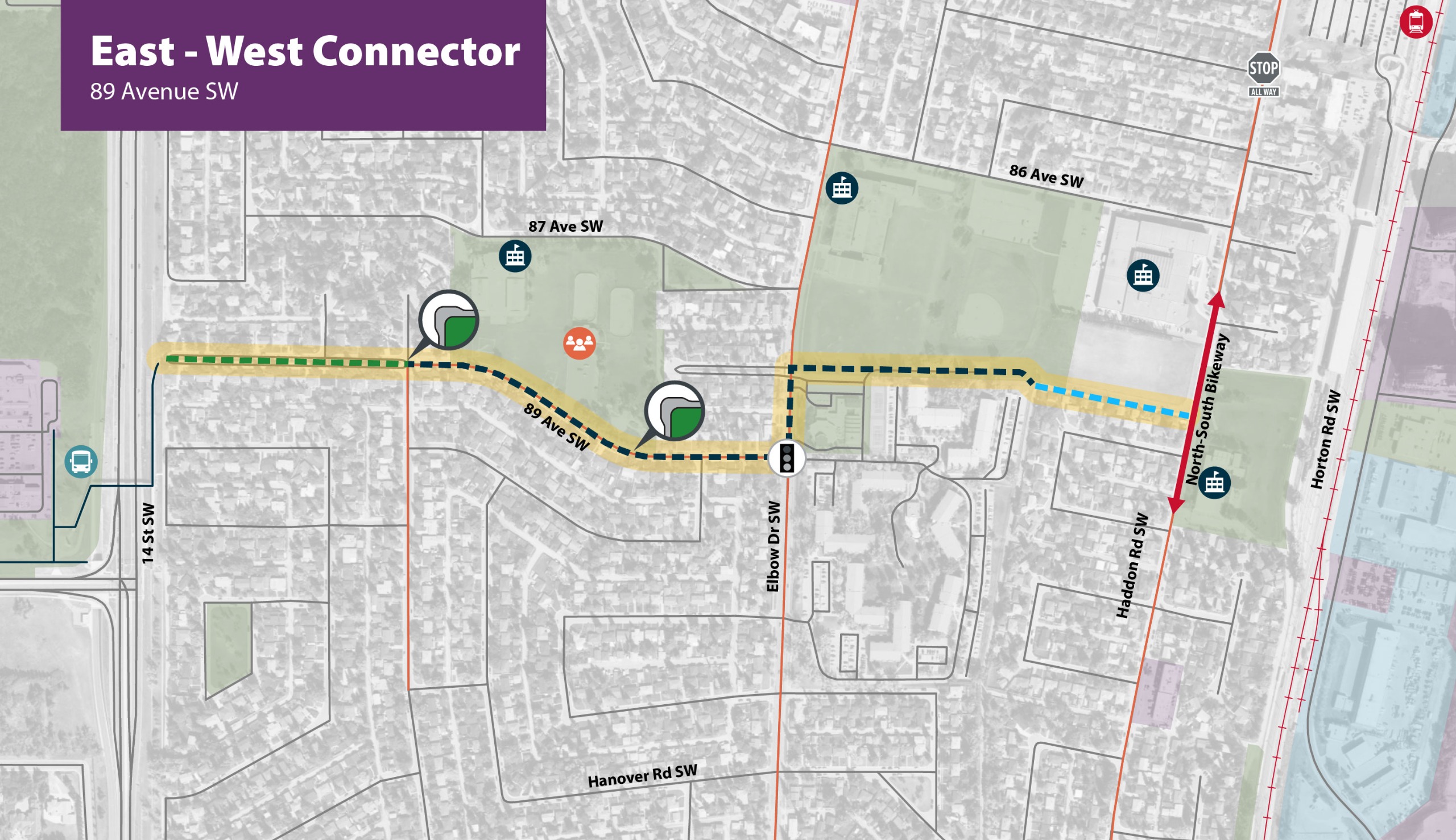 The proposed design for the east-west connector extends along 89 Ave SW from 14 St SW to Elbow Dr. and then through the field and laneway at the south end of Woodman and Our Lady of the Rockies Schools. The route transitions from a bike boulevard to a multi-use path and then to a paved laneway before it connects with Haddon Rd SW and the north-south bikeway.