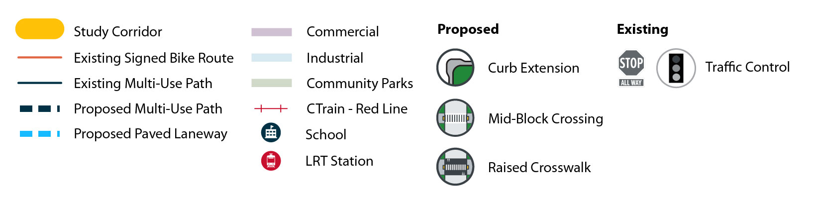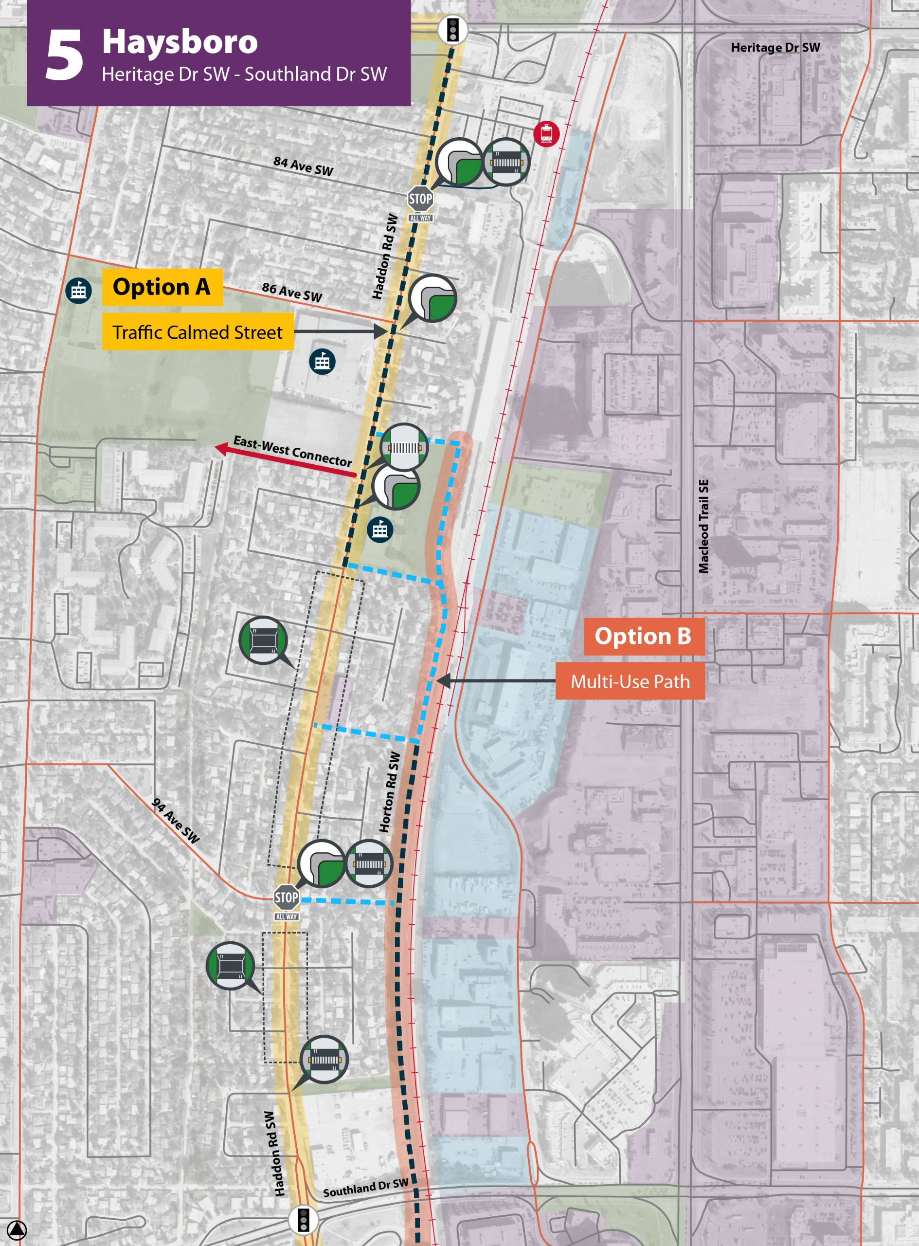 The proposed design in Haysboro extends along Haddon Rd from Heritage Dr SW to Southland Dr SW. A multi-use path is proposed on the west side of Haddon from Heritage Dr to Hogarth Cres (south). From here, the wheeling route shifts east adjacent to the C-Train tracks, via paved laneways. Additional traffic calming measures are proposed on Haddon Rd SW to slow vehicular traffic.