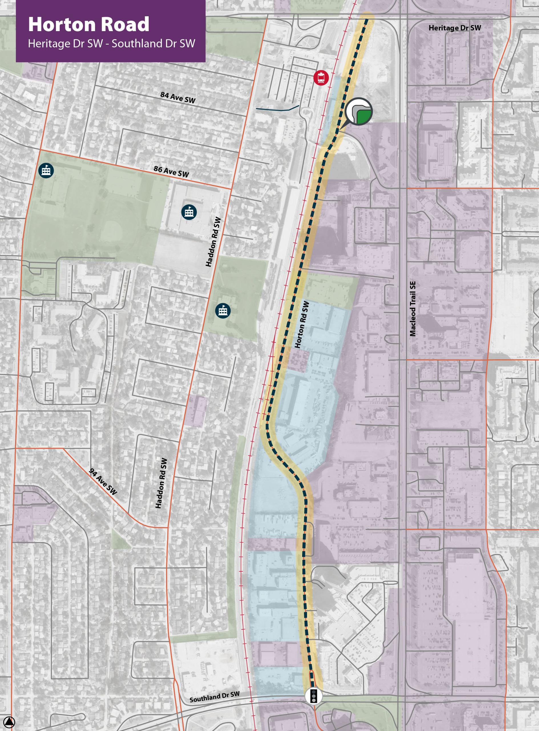 The proposed design for the Horton Rd S.W. extends along its full length, from Heritage Dr S.W. to Southland Dr S.W.. The design includes a sidewalk on the west side of the road and a multi-use path on the east side of the road. A connection from Horton Rd to Haddon Rd on Heritage Dr is also being reviewed. On-street parking will be delineated with curb extensions, causing minimal reductions in existing on-street parking supply.