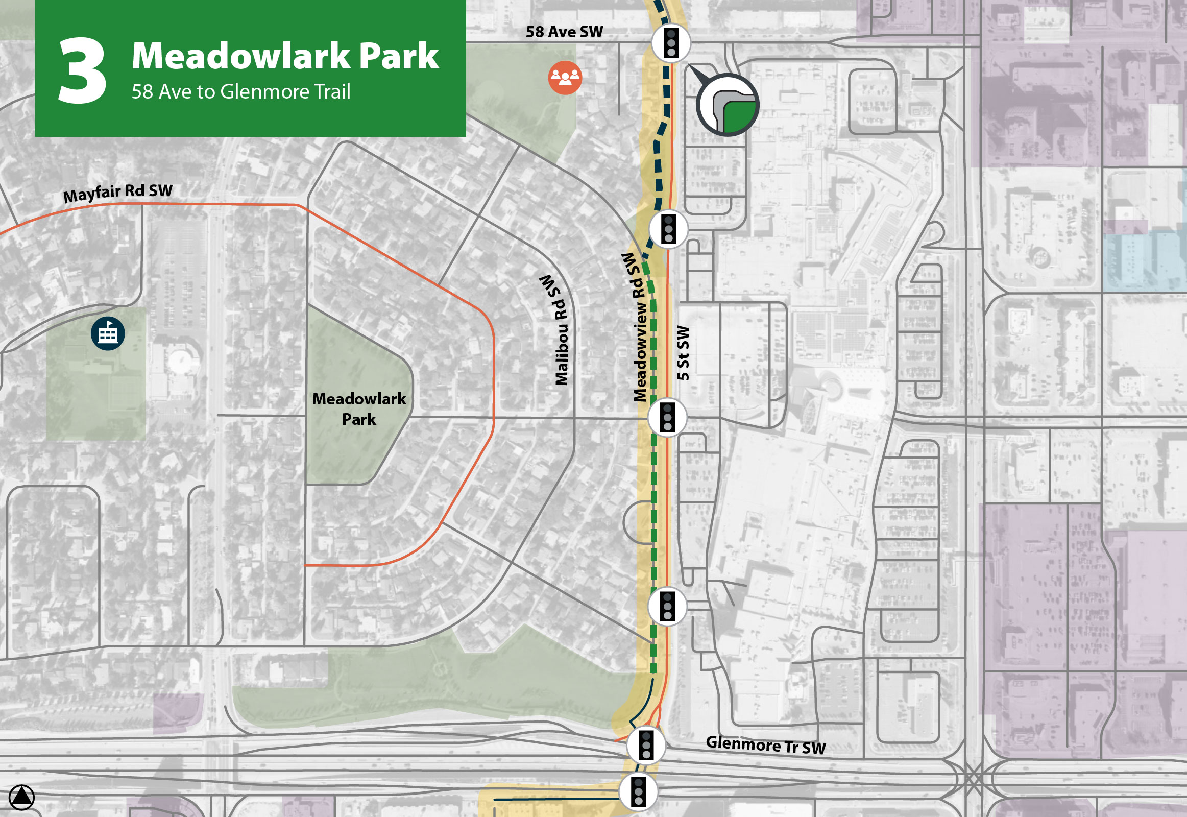 The proposed design in Meadowlark Park extends from 58 Ave to Glenmore Tr. SW. The proposed design involves providing a multi-use path adjacent to the laneway, reorienting and widening the existing pathways through the park and a bike boulevard on Meadowview Rd SW.